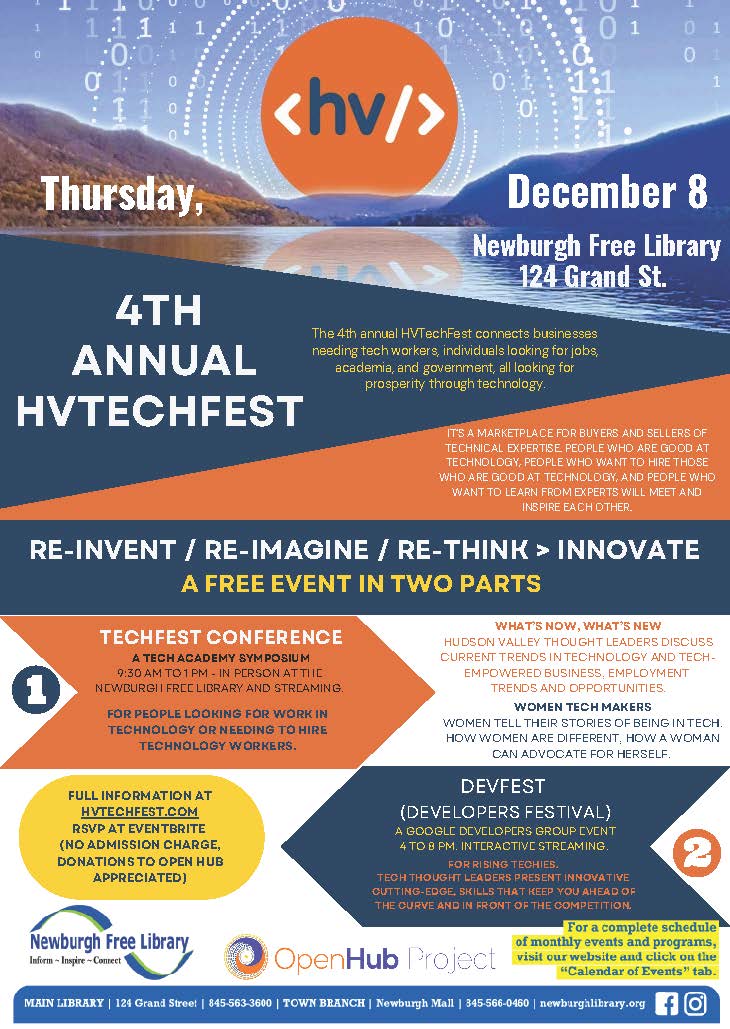 Mark Thursday December 8th on your calendars, it’s the next big step on the Hudson Valley’s road to technology-fueled growth. Open Hub is presenting, and the Newburgh Free Library is hosting a full day of panel discussions and cutting-edge presentations focused on jobs, change, and prosperity through digital technology.